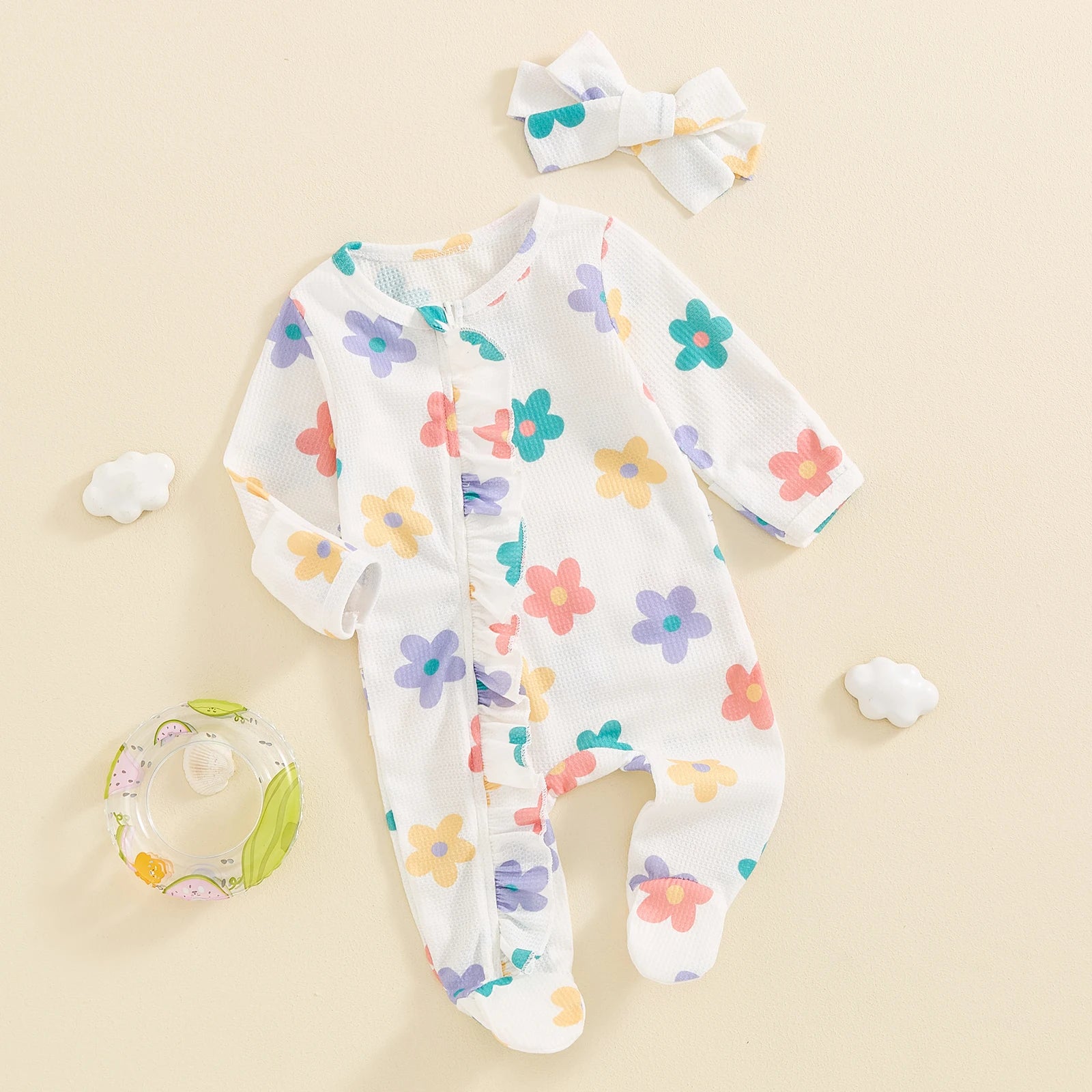 Baby Girls Flower Print Ruffled Zip Footie Pajamas Bow Set