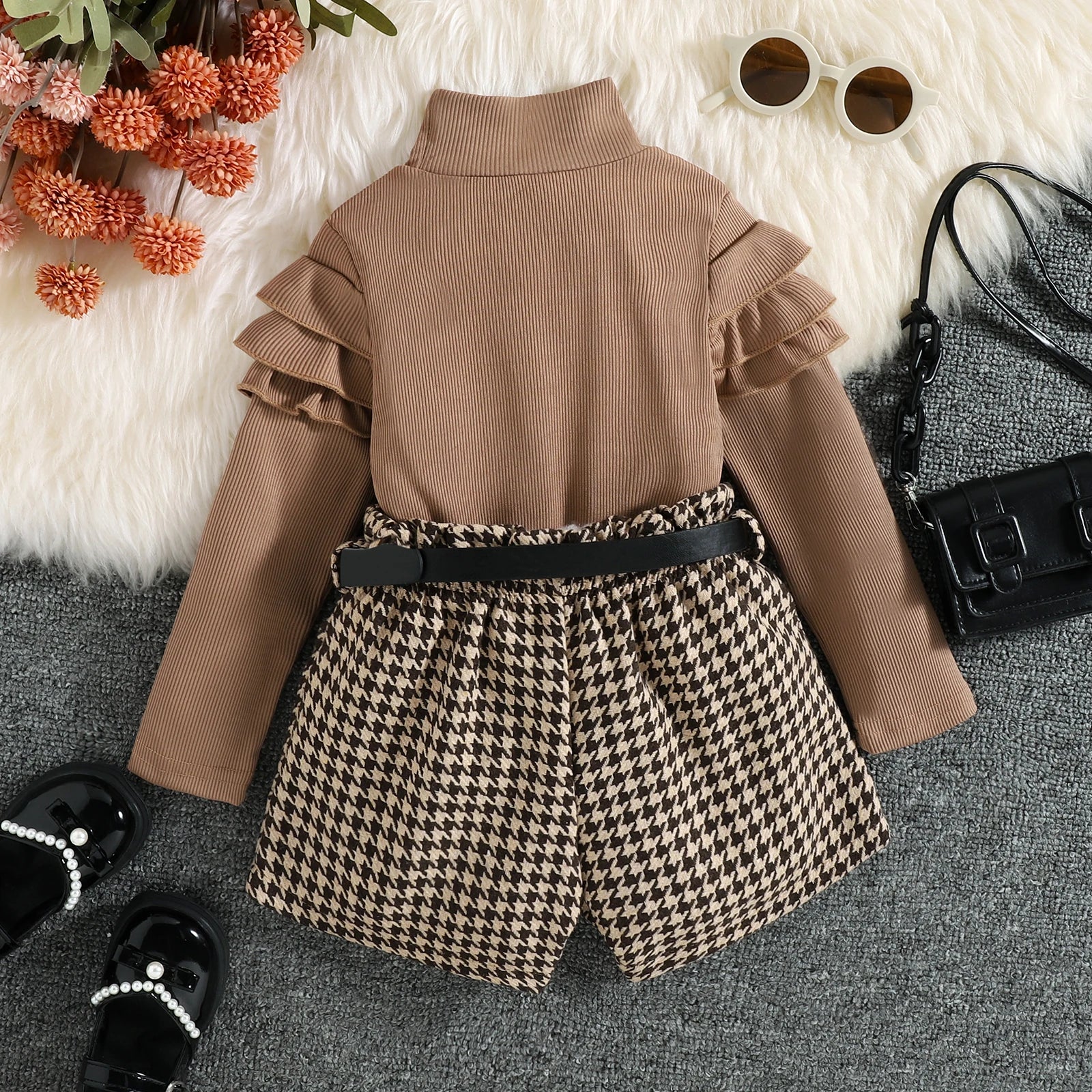 Girls Ruffle Sleeve Knit Turtleneck Houndstooth Belt Short Set